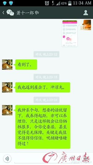举报帖中附有一名男子与一名女子的合照、短信和微信对话截图以及医院产检B超图片,合照是两人躺在床上自拍的,颇为不雅。在微信截图中,一名女子给微信ID为“萧十一郎”的人发送了一张图片,“萧十一郎”随后用粤语回复表示,如果该女子想留下孩子,他也可以养得起。在短信对话中,两人也是表达了相似的意思。
