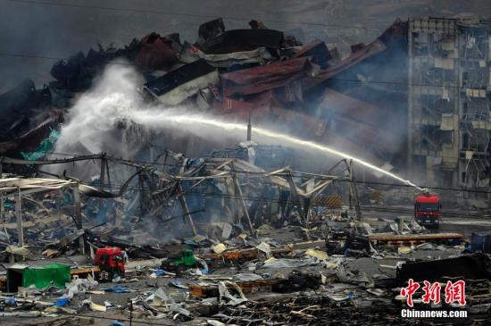 8月14日,爆炸事故现场,一辆消防车正在喷射高压泡沫,消灭残火。。 中新社发 佟郁 摄