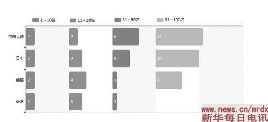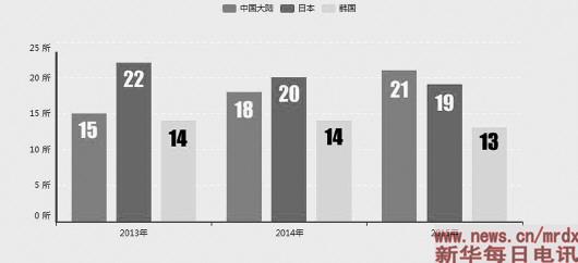 中日韩三国三年来在亚洲大学排行榜上入围高校数的变化