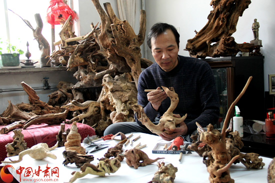 杜海鹏正利用业余时间创作“美女根雕”。郭惠民 摄