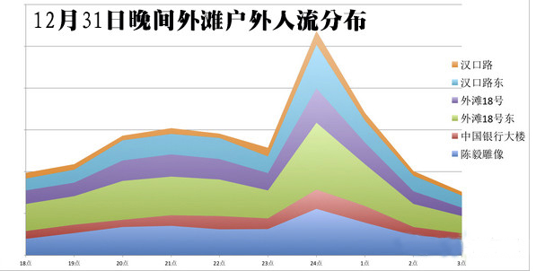 (个推公司绘制的12月31日晚6点至1日凌晨3点的人流分布图,晚上9点和24点为两个峰值)