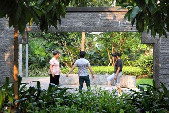 村民在猎德村花园小区内锻炼身体。猎德村改造后“城中村”了无踪影,如今的猎德花园设施齐全,堪比豪宅