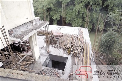 这是一幢2层楼高的联排别墅,背靠一品河。从侧面看过去,一个近50平米的水泥平台正拔地而起,上面堆着木板、钢筋等建材。