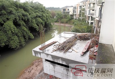 昨日,巴南区一品全兴别墅区,业主私自搭建游泳池,阻挡了河道。 重庆晨报记者 苑铁力 摄
