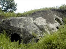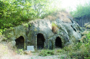 到了桦墅,记者才发现,这个村子有很多小村子组成。在知情人的引路下,记者来到其中一个小村。进入村子,从村旁的一条小路爬上村旁边的小山包,走上不到10分钟,记者眼前豁然开朗。在一个小山沟的尽头,出现了多个形似蜂窝的石窟。