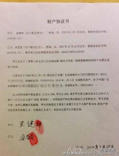 而在协商离婚等事宜时,梁健锋也开始怀疑妻子是“有计划地欺骗我将所有房产转移给她,”在梁健锋出示的一张财产协议书中,梁称其名下的两处房产均是由女方全权处分,而梁无权干涉。