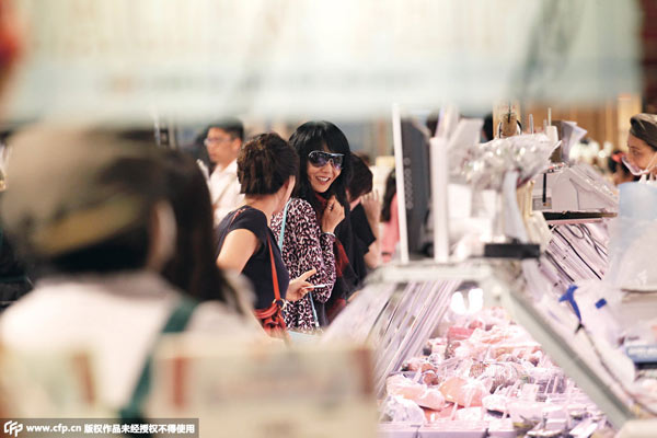 选购完肉类后,一名穿白衫的男子走到她们处会合,一行人再往零食部慢行。期间有不少认出Maggie的顾客,看见她的纤瘦身形,均忍不住说她“好瘦!”然而Maggie却全程充耳不闻,只顾兴高采烈地跟同行的朋友走到猪肉干货架的面前,谈论猪肉干的款式。可惜因停留看Maggie的顾客似乎愈来愈多,她惟有跟同行女士先行告退,由白恤衫男子和另一黑超女士负责买单。