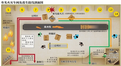 离起火点最近的王阳文夫妇在十几秒内就被黑烟吞噬了。郑兰兰离着火点稍远,她转身叫了丈夫孙增健一声,就慌张着从东侧绕过流水线,跟着人群寻找逃生通道。