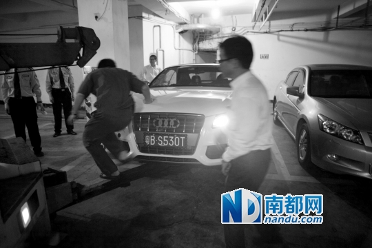 交警在罗湖区松园路景园小区地下停车场拖走涉事车辆奥迪s5。