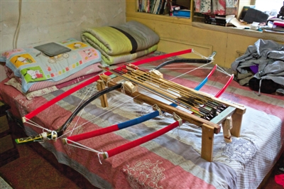 放在床上的“诸葛连弩”。昨日,廖师傅展示自制的诸葛连弩。新京报记者周岗峰摄