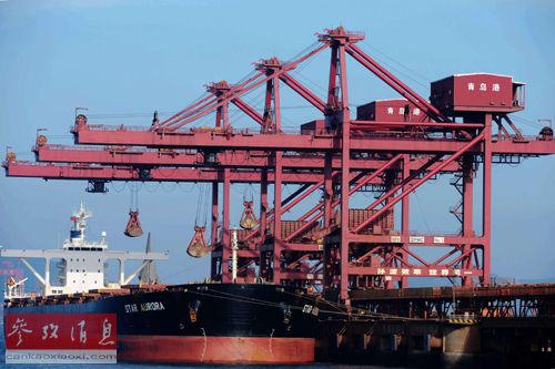 在山东青岛港,货轮在铁矿石码头卸载铁矿石。 新华社发