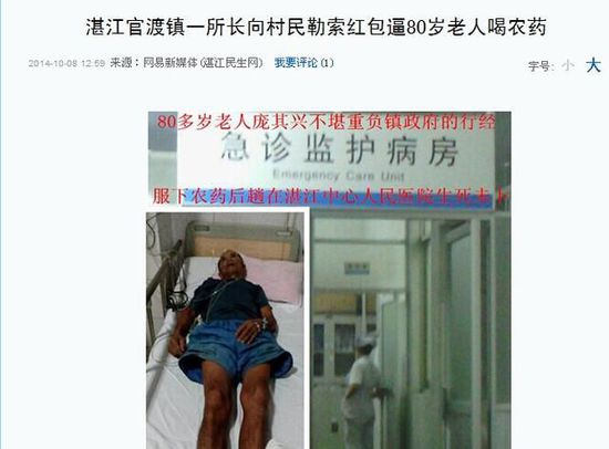 于是,各大网站的“湛江官渡镇一所长向村民勒索红包,逼80岁老人喝农药。”帖子便出现了。