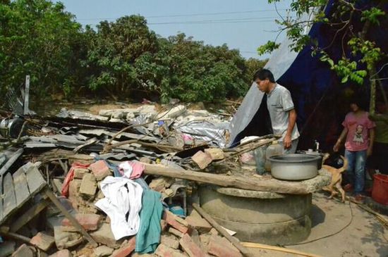 廖泽旺全家暂时在9月25日拆违行动中拆掉的平房原址搭棚生活