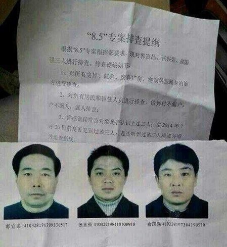 排查提纲共有5点。提纲称,对所有房屋、院舍、废弃厂房、窑洞等能藏身的地方进行排查;对所有居民和暂住人员进行排查,坐到村不漏户,户不漏人、逐人排查;详细询问排查对象是否认识上述三人;在2014年7月26日后是否见到过这三人,是否听到过该三人踪迹并顺线追查到底;排查情况按排查要求详细填写;发现重大情况及时上报指挥部。