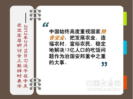 中国始终高度重视国家粮食安全,把发展农业、造福农村、富裕农民、稳定地解决13亿人口的吃饭问题作为治国安邦重中之重的大事。