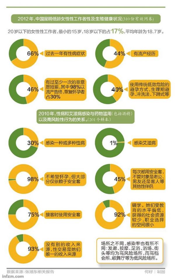 2012年,中国昆明低龄女性性工作者性及生殖健康状况以及2010年,性病和艾滋病感染与药物滥用(包括酒精)以及高风险性行为的关系。 (何籽/图)