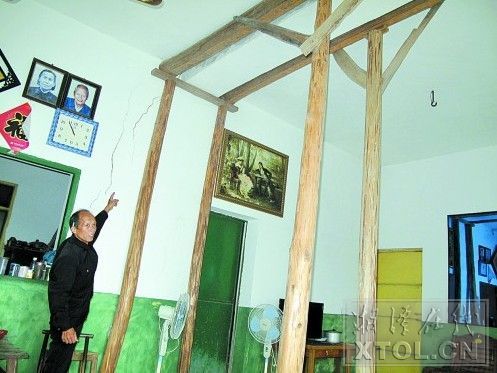 夏师傅家房屋的开裂情况同样让人触目惊心,6根粗大的木桩立在客厅中央,顶着房屋的主梁,很难想象这种环境下还住着人。