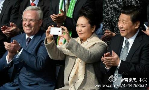 彭丽媛随习近平访问德国观看中德青少年足球友谊赛时,用一款白色手机拍照的图片于星期六(3月29日)出现在网上,这张图片勾起很多人的好奇心:第一夫人究竟用的什么手机?