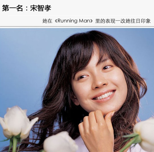 宋智孝(Song Ji Hyo),韩国演员、主持人。1981年8月15日出生于韩国庆尚北道浦项市,毕业于韩国京畿大学。2003年开始影视作品的拍摄,一直以玉女形象示人,先后在《宫》化身皇太子的初恋情人、《朱蒙》里扮高丽皇后,新片《霜花店》又是演王后,宛如“王后专业户”。2010年7月起出演韩国SBS电视台周末综艺节目《Running Man》,她在《Running Man》里的表现一改她往日戏剧中的角色带给观众的印象。