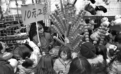 “我们每一家摊位的位置都是抽签决定,”李先生说,公园将游戏摊位承包给几家公司,几家公司再分别租给游戏摊主,摊主拿挣得的游戏币跟公司进行结算,“2块钱一个游戏币,初六一天我们一个摊位卖了7000个币,挣了一万多块钱吧,今年比去年好一些。”李先生说。