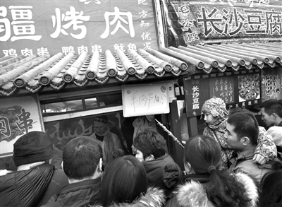 昨日15时许,龙潭庙会湖西侧商业区内,当其他商铺还在吆喝“最后一天甩卖”时,写有“标王肉串”的铺位却格外安静。帐篷里已无肉可卖,工作人员也站在路边,换下了卖肉串时穿的蒙古包服装。