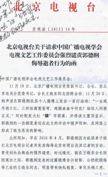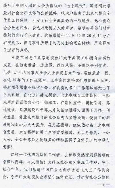 11月19日,北京电视台台长王晓东因病去世,次日郭德纲在微博上发出一首打油诗,引发争议,被指含沙射影、侮辱因病去世的王晓东,引发各界哗然。而12月2日,北京电视台向国家新闻出版广电总局中国广播协会电视文艺工作委员会发函,要求强烈谴责郭德纲侮辱逝者的行为。而在这份函中,北京电视台方面认为,早在2010年8月,郭德纲因为纵容弟子殴打北京电视台记者并发侮辱北京电视台及其记者的言论,曾受到社会舆论的强烈谴责,“时过境迁,就在王晓东台长刚刚离世之际,郭德纲发表的这篇微博含沙射影,公然贬损侮辱已故的王晓东同志,明显带有挟私报复、幸灾乐祸之意,是对社会公序良俗的公然挑衅,极大地伤害了北京电视台全体员工的感情,引发了社会主流舆论的一致谴责。热心观众纷纷致电我台,表达对无德艺人的声讨。希望有关部门对郭德纲的言行予以谴责。”而北京电视台也恳请中国广播电视学会电视文艺工作委员会,呼吁广大电视从业者坚守媒体责任,对违背社会公德的的恶俗行为予以谴责,对缺乏良知的艺人予以抵制。