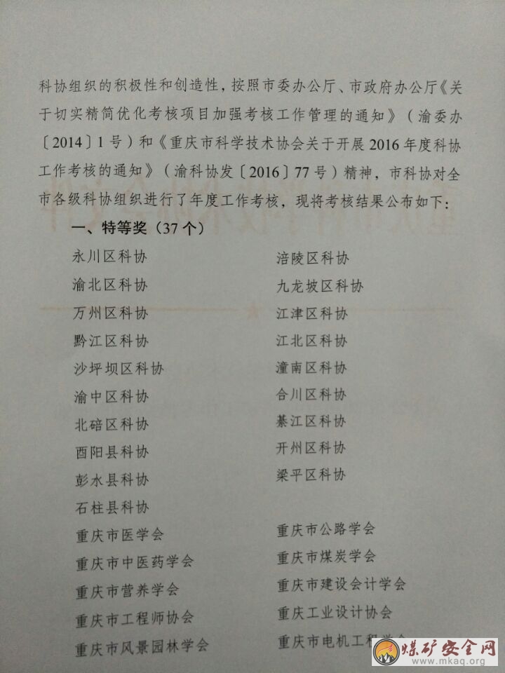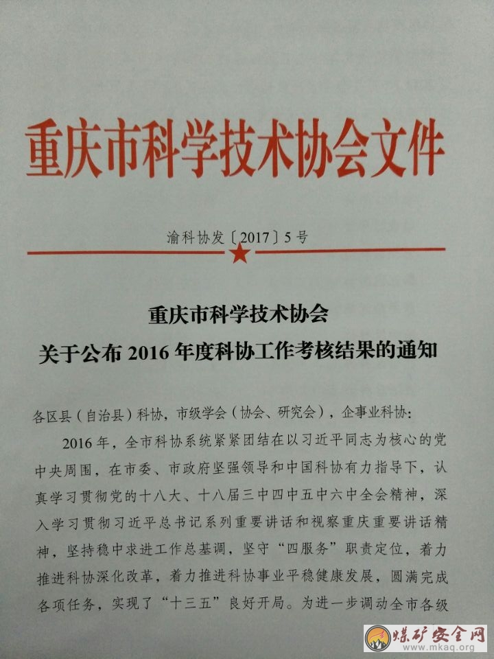 重庆市煤炭学会再获2016年度科协工作考核特等奖