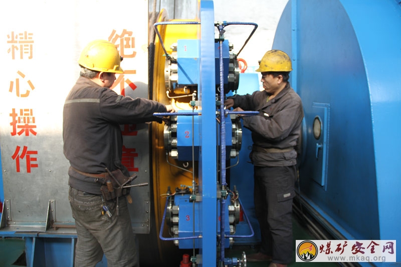 为确保安全生产,平煤神马集团香山矿认真开展节后安全自查活动。近期,该矿机电队对提升系统进行全面检修。图为2月21日上午,该队南主井检修班人员正在对绞车盘型闸进行检修。(香山矿 李可 摄)