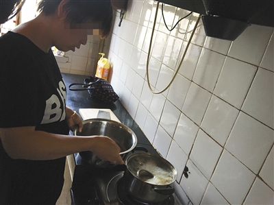 胎盘倒卖者正在出租房内将胎盘煮水,捞出漂浮的杂质。