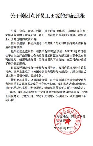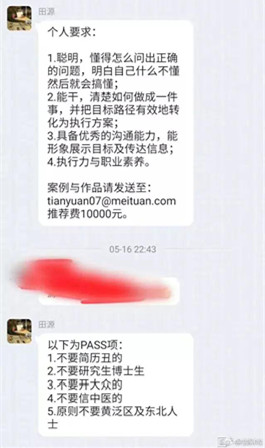 按照美团官方的解释,歧视招聘“五不要”乃是田源个人观点,与公司的价值观相悖,亦有美团员工称“田源不是hr”。总之祸是田源闯的,那么锅也应该田源自己背。可是解释并未说明白,田源在美团内部的具体岗位究竟是啥,如果“田源不是hr”,为何他有权在内网群发布招聘信息?如果是其个人所为,那么他就是越权办事,如果是人事部授权给他,那么招聘信息有无经过人事部审核?充满“地域歧视、爱好歧视类”的招聘信息,缘何就能够在内网群公开发布?