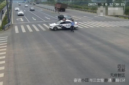 图为四川成都,交警把车拦停在斑马线上。