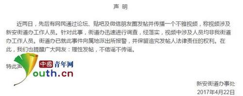 该不雅视频由于清晰度较高,所以其中男女主角是不是新沂市新安街道办的工作人员,其实不难分辨。对于不雅视频,新安街道办在新沂门户网辟谣称,视频中涉及人员均非其街道办工作人员,街道办已就此事件向属地派出所报警,并保留追究发帖人法律责任的权利。