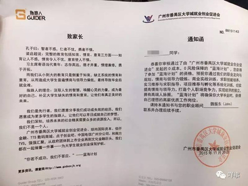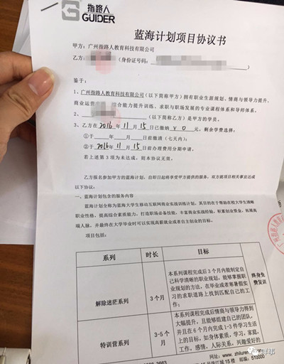 以校内公益讲座的名义,吸引学生参加一对一免费的职业测试。其间,“导师”不断游说学生加入职业培训班,许以美好愿景,后让学生通过第三方贷款公司无抵押贷款交学费。日前,南都记者陆续接到数十名广州高校的学生和家长报料,称被“广州指路人教育科技有限公司”用这样的套路让毫无经济能力的他们背上了万元债务。记者发现,已有约270名学生有此遭遇。(4月20日《南方都市报》)