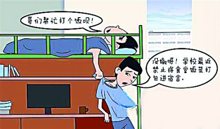 4月19日,一则关于大连财经学院学生就餐的信息,在微博、贴吧中被关注和广泛议论。这一切源于18日学校后勤发出的一则通知。记者看到,这则通知中写到:从即日起,各公寓如发现订餐、送餐的同学,将给予该同学寝室断电3日;如有同学举报订餐、送餐情况,一经查实并对商家进行处罚后,给予该同学500元奖励。(4月20日《半岛晨报》)