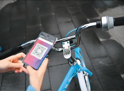 志愿者使用手机扫码租用自行车。新华社记者 黄宗治摄
