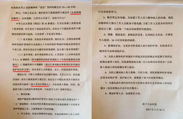 2月24日河南精神病人持筷伤人致女精神患者三死一伤事故发生后,涉事医院洛宁大众医院在给上级管理部门的汇报材料中称,“当班人员既没有违反操作规范,又尽心尽力,多次验证保护,没有主观故意和主观过失,而是由于不能抗拒或者不能预见的原因所引起的(病人是奇才和怪人),才造成重大事故。”(4月5日澎湃新闻)