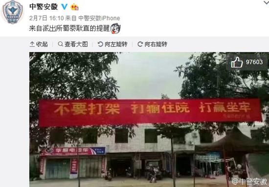 近日,一张劝解别打架的标语,走红网络。经了解,此标语其实是海南白沙县公安局挂出来的,因年前发生一起打架事件,打输的那位住院了,打赢的被抓了。挂出这条横幅后,“春节期间一起打架斗殴的事件也没发生”。(2月8日澎湃新闻网)