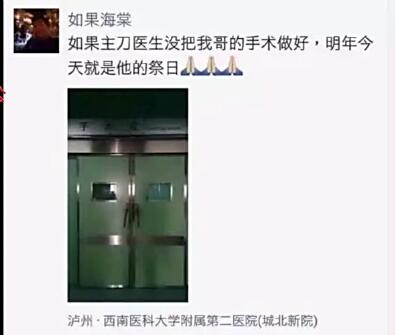 “如果主刀医生没把我哥的手术做好,明年今天就是他的祭日。”6日,这样一条“杀医”朋友圈,迅速在网上传开。发布者随后表示,发那个朋友圈“只是希望得到亲友的关注,并且对他哥手术后多些关心和鼓励,并无他意。”(1月9日人民网)