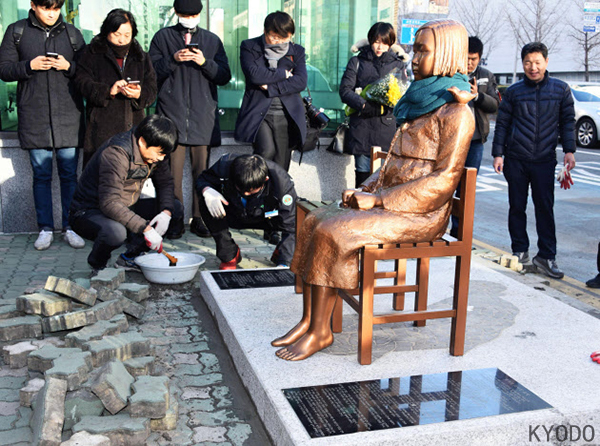 日本内阁官房长官菅义伟6日在记者会上表示,韩方设置慰安妇少女像“将对日韩关系造成不好的影响,侵犯领事机构的威严,极为遗憾”。日韩两国的争执还闹到了华盛顿。日本政府6日发表声明说,首相安倍当天与美国副总统拜登通了电话,安倍对拜登说,背弃慰安妇协议不是有建设性的行为。拜登则表示,美国支持该协议,强烈希望日本和韩国都能落实协议。(1月7日《环球时报》)