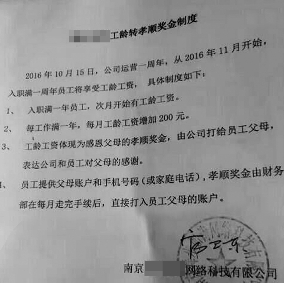 近日,南京一家网络科技公司推出一个名为“工龄转孝顺奖金”的制度,规定从今年11月开始,入职满一年员工将享受工龄工资(每工作满一年,每月工龄工资增加200元);而公司又规定,这笔补贴不直接发给员工,而是转化为“感恩父母的孝顺奖金”,由公司发给员工父母,“表达公司和员工对父母的感谢。”(10月25日《现代快报》)