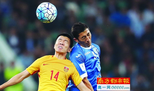 10月11日,中国队球员孙可(左)与乌兹别克斯坦队球员艾哈迈多夫在比赛中争顶。
