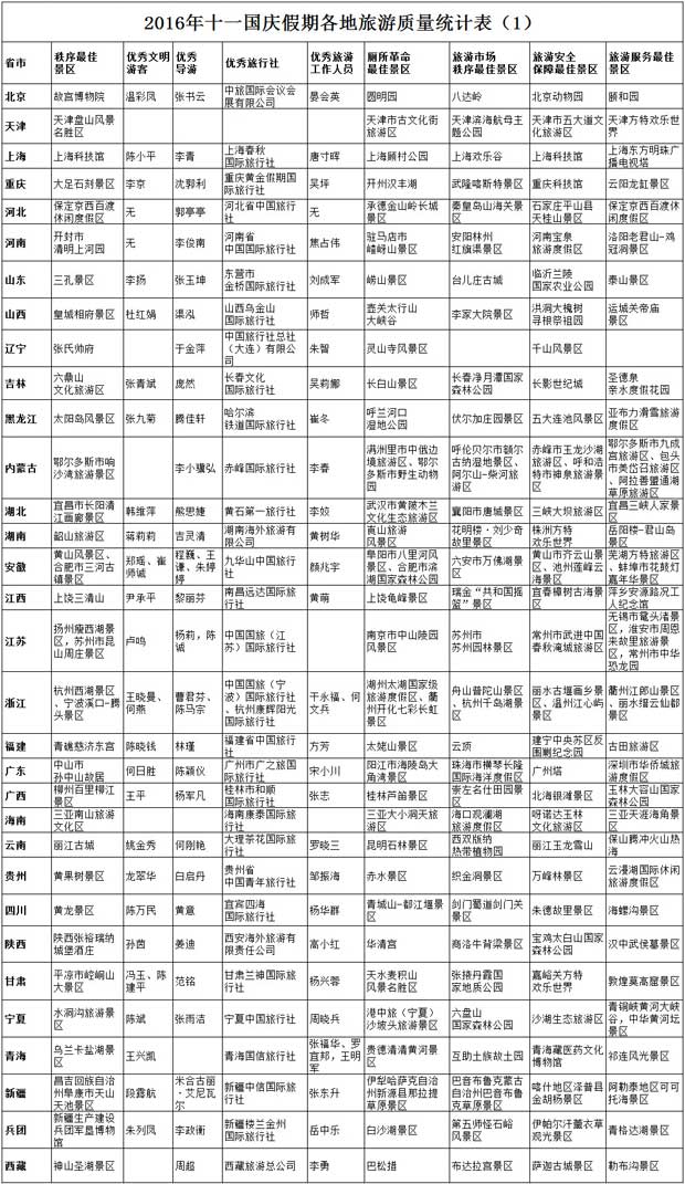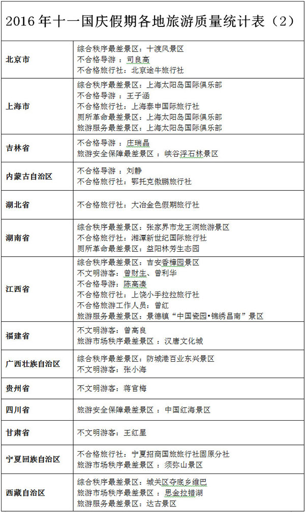 10月9日,国家旅游局发布十一假日旅游“红黑榜”,集中表扬一批最佳景区、优秀旅行社、优秀导游、优秀旅游工作人员和文明游客,同时也对假日期间厕所革命滞后、环境脏乱、管理混乱、服务恶劣的旅游经营单位和从业人员以及不文明游客进行了曝光。(10月9日中国新闻网)