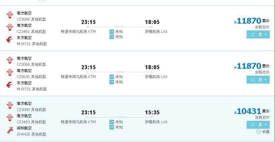但是,新浪网在某旅游网站查询票价发现,从加德满都飞往拉萨的机票票价都在10000元以上。