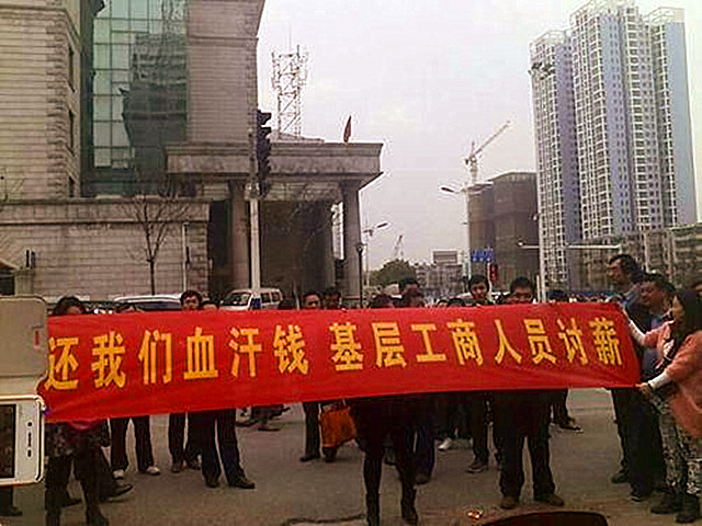 事情发生在3月18日下午,当时,很多人集聚在淮南市工商局大楼门口,打出了“基层工商人员讨薪”的横幅,引起了很多路过市民的围观。