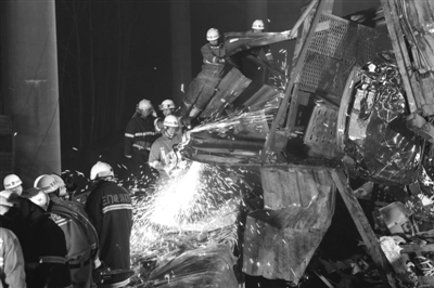 昨晚,消防战士正在破拆一辆摔碎的大卡车。昨日8时许,河南连霍高速三门峡段义昌大桥一侧垮塌,现已确认9死11伤。新京报记者尹亚飞摄