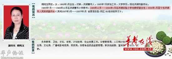 12月30日,中共荆州市委组织部新闻发言人就网上热议的“洪湖小学女教师直接晋升副市长”作出回应,胡纯玉在洪湖实验小学任教科室主任,2004年1月由人大代表依法联名取得候选资格,并在洪湖市第五届人民代表大会第一次会议上由代表依法选举为洪湖市人民政府副市长。(据荆楚网11.12.30)