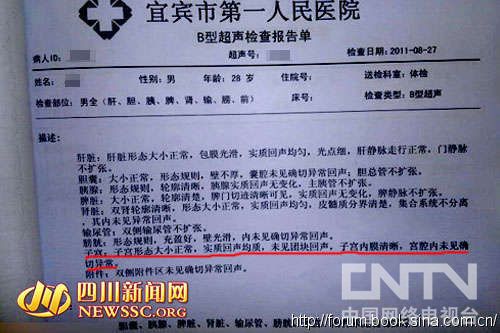 据四川新闻网9月22日报道,近日,宜宾网络上流传一张B超检查报告单的图片,显示一男子被检查出“子宫形态正常”。昨(21)日,记者从出具该报告单的医院证实,该报告单真实,系工作人员制作失误。院方表示,将立即联系当事人向其致歉,并对相关科室责任人员进行调查处理。话说20日中午,网友将一张B超检查报告单的图片发到宜宾零距离论坛。图片显示,出具报告单的是当地著名三甲医院--宜宾市第一人民医院,受检人为28岁的杜先生,检查部位为"男全"。但在该报告单的检查描述中,除肝胆等器脏的检测结果外,还有"子宫大小形态正常……子宫内膜清晰,宫腔内未见确切异常"等字样。