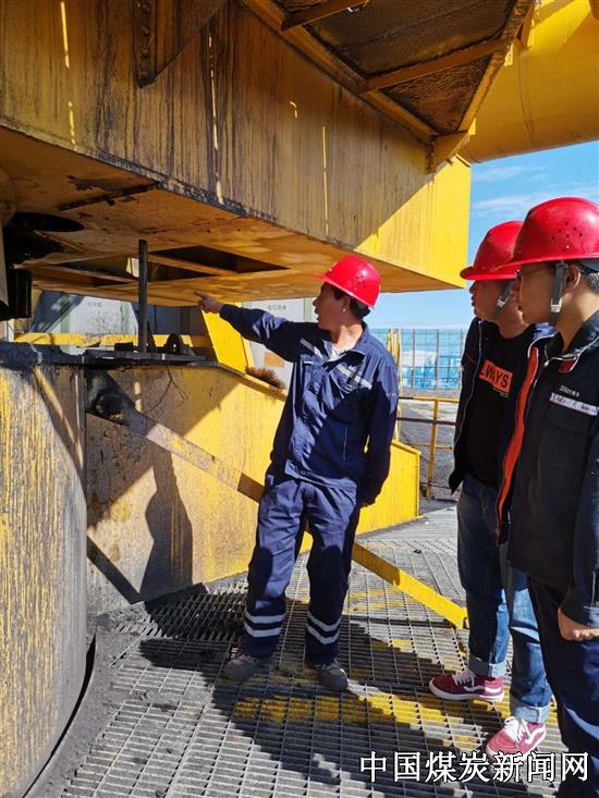 在检查过程中,胶带运行一部运行队长邵金剑对运行班组的工作情况进行了说明,并带领新入职大学生深入现场,熟悉、了解生产一线的工作环境,理论结合实践,对斗轮堆取料机概况、基本结构、操作要求及规程进行详细讲解。如对于斗轮开机前应对设备的各润滑点、螺栓进行检查;巡检时身体任何部位不能接触设备的旋转部件;开机时现场岗位工、中控操作员必须相互确认后方可开机;停机检查设备时,必须按照相关程序切断电源、挂警示牌,办理停电工作票后方可进行检查;开机之前必须办理送电工作票后方可开机。