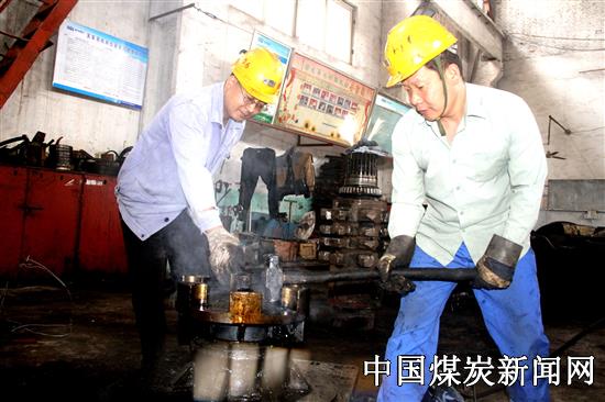 图四:9月5日,该矿机修车间职工正在加班加点装配破碎机端轴组件
