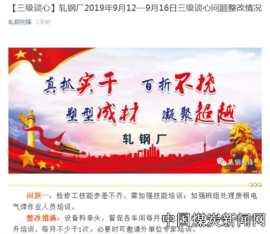 轧钢厂始终坚持问题导向、以上率下、求真务实基本原则深化学习研讨,落实先学一步。轧钢厂还成立宣讲团,以常态化形式宣讲习近平新时代中国特色社会主义思想和党的十九大精神,自觉对表对标、及时校准偏差,切实在广大党员干部中将主题教育入耳、入眼、入脑、入心。同时,每月至少组织一次理论中心组学习和专题研讨,切切实实、真真正正解决存在的思想问题。持续开展“书记上台讲党课”活动,在抓好“关键少数”主题教育工作的同时,及时向广大党员干部拓展,管住“绝大多数”,真正把学习成效体现到增强党性、提高能力、改进作风、推动工作上来。